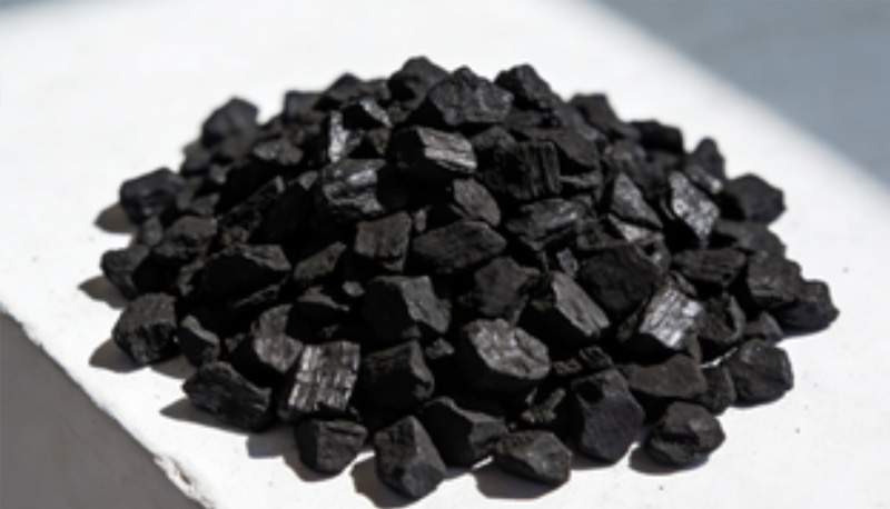 配图 1:展示椰壳酸洗活性炭的实物图,颗粒饱满,呈现深黑色,背景可搭配简洁的白色台面,突出其外观特征。