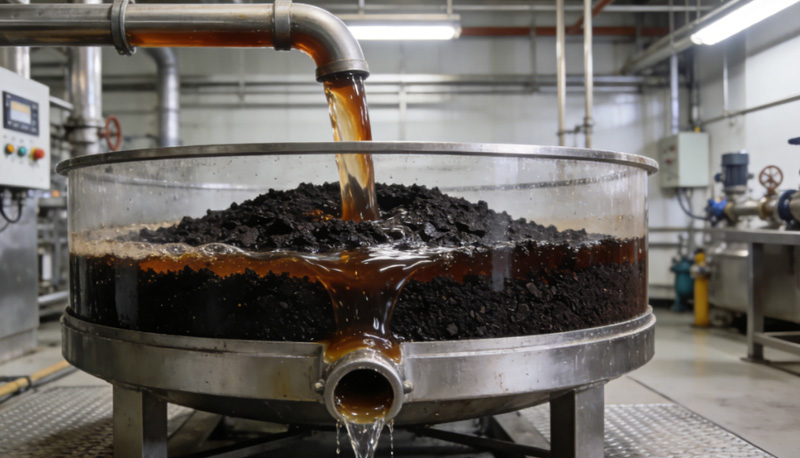 配图 4:制糖工业中糖液提纯场景,展示糖液通过装有椰壳酸洗活性炭的过滤装置,原本带有颜色的糖液经过过滤后变成清澈透明的液体。